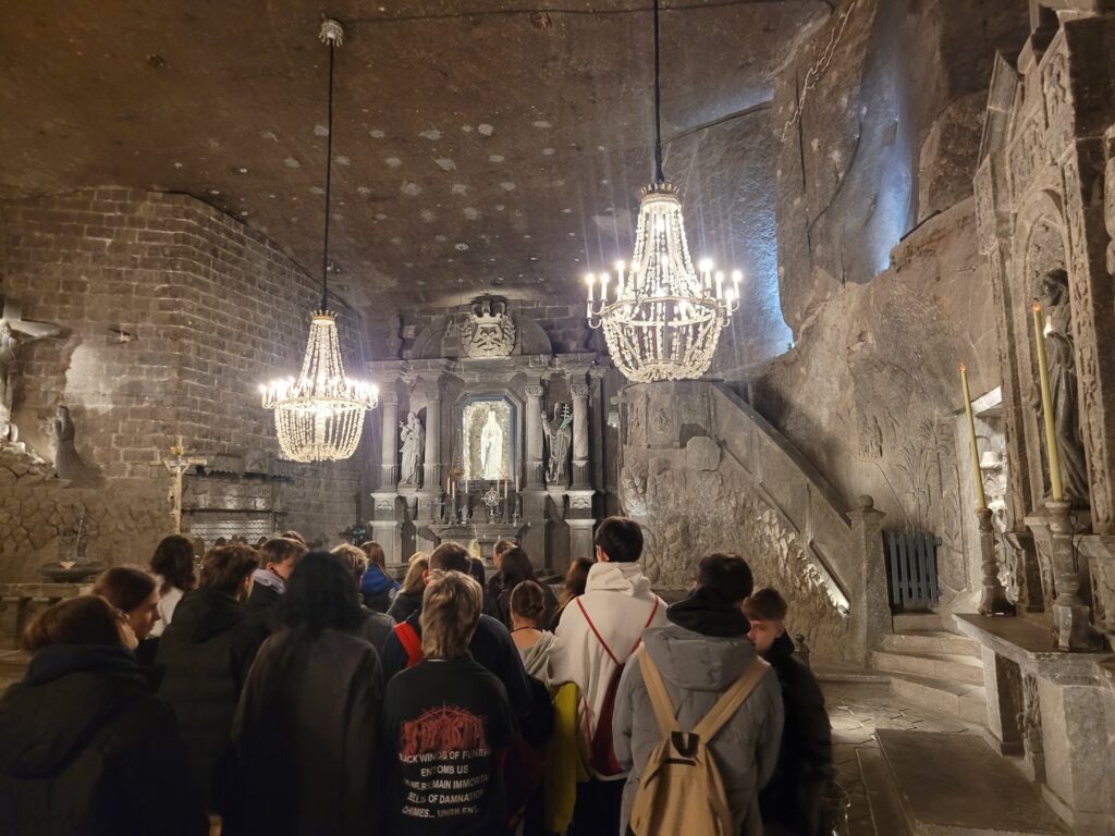 Kolejnym punktem wycieczki było zwiedzanie Kopalni Soli w Wieliczce, podczas którego uczniowie poznali jej bogatą historię, zachwycili się podziemnymi korytarzami i niezwykłymi solnymi dziełami. ![]()